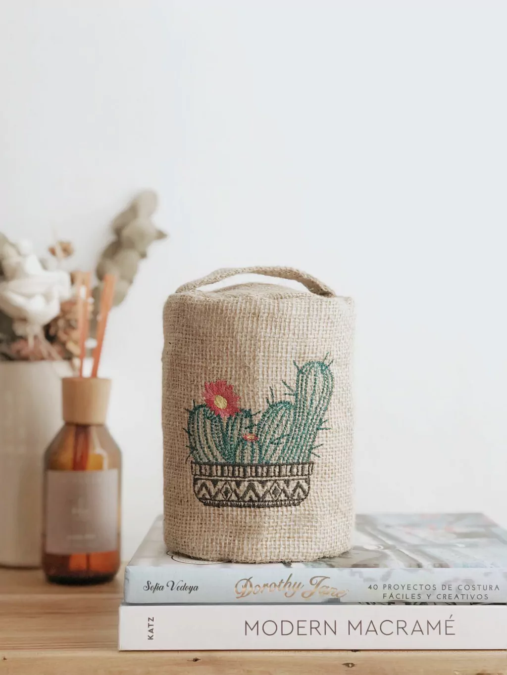 Door stop de arpillera bordada con manija para trasladarlo